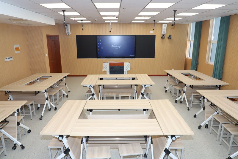 高清录播、直播带货教室位于拖龙山校区行政办公楼8楼,建筑面积120平方米,配备多功能教学终端、智慧课堂云平台、高清直播套装、自动录播系统等设施,教室设置观众座位45个,观摩室设置专家座位13个。