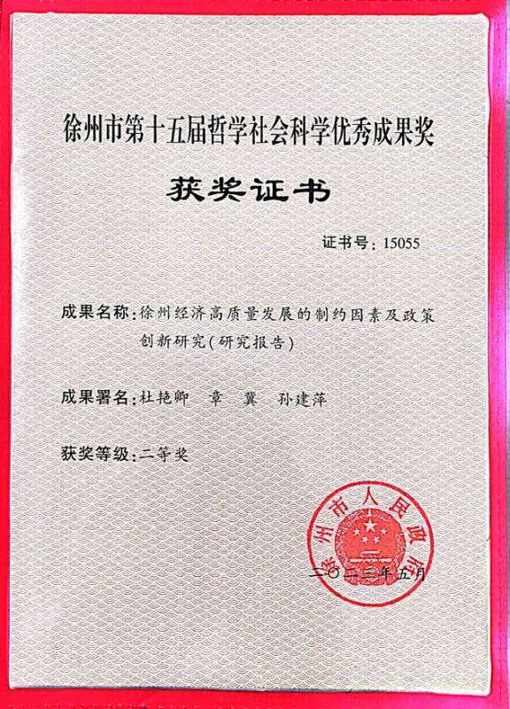 在“徐州市第十五届哲学社会科学优秀成果奖”评选活动中,我院杜艳卿、章冀、孙建萍团队提交的《徐州经济高质量发展的制约因素及政策创新(研究报告)》荣获二等奖。特此向全校师生报喜,向杜艳卿、章冀、孙建萍三位老师表示祝贺。
